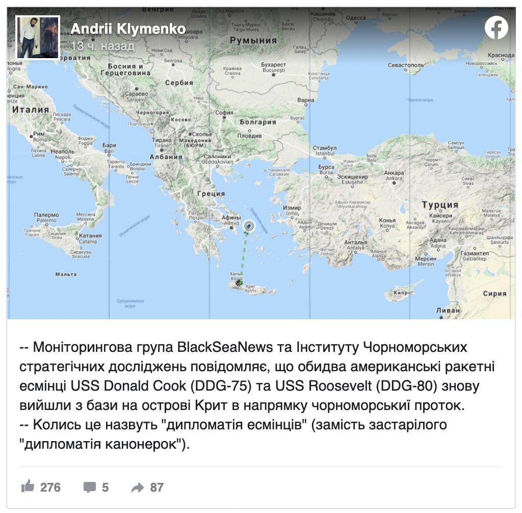 Керівник проекту в Інституті Чорноморських стратегічних досліджень Андрій Клименко заявив про те, що американські есмінці вийшли з бази на Криті в напрямку чорноморських проток.