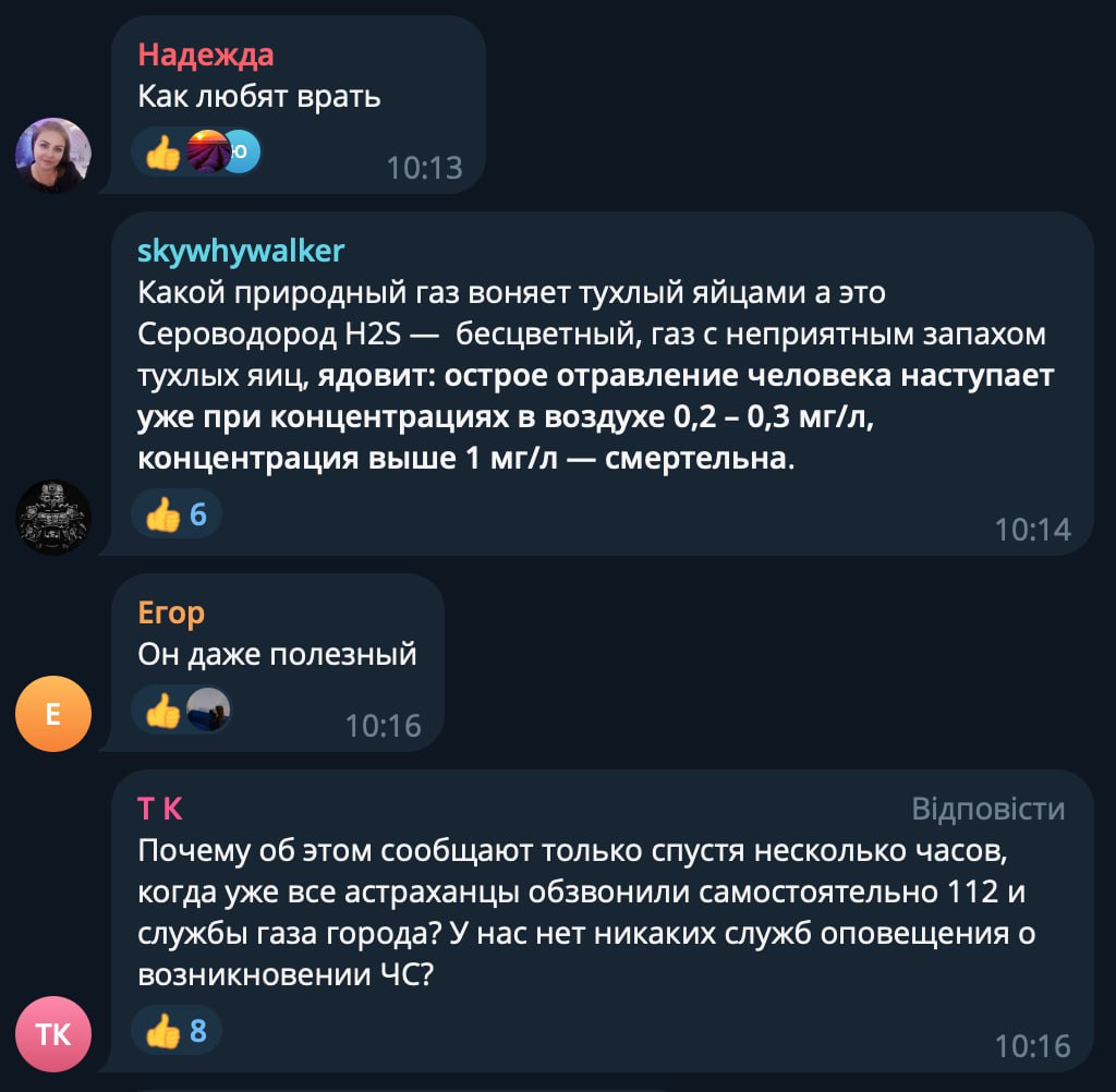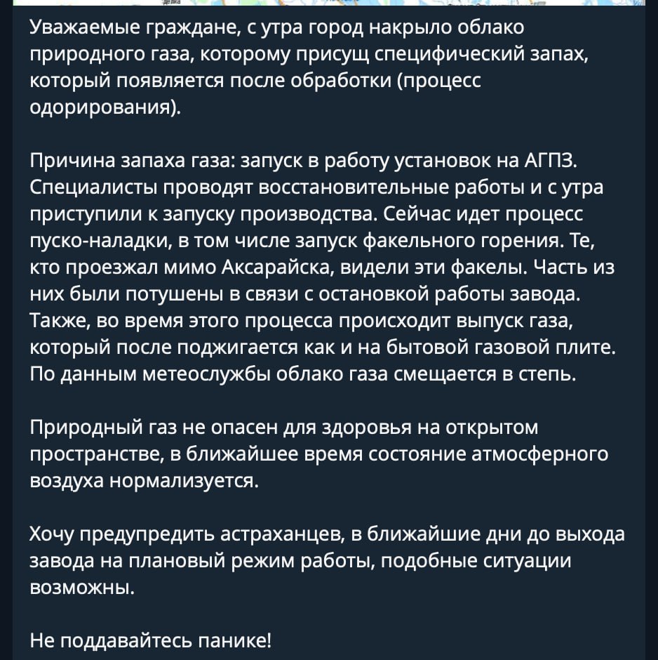 “Природний газ не є небезпечним для здоров’я на відкритому просторі, найближчим часом стан атмосферного повітря нормалізується. Хочу попередити астраханців, найближчими днями, до виходу заводу на плановий режим роботи, подібні ситуації можливі”, – запевняє він.