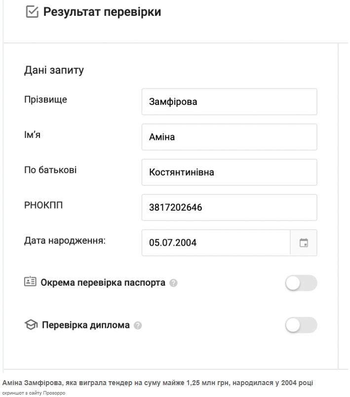 Як фізична особа-підприємиця Аміна Замфірова зареєструвалася лише 12 липня 2024 року. Проте це не завадило Управлінню освіти Сафʼянівської сільської ради в один день без конкуренції віддати їй два підряди загальною сумою майже 1,25 млн грн.