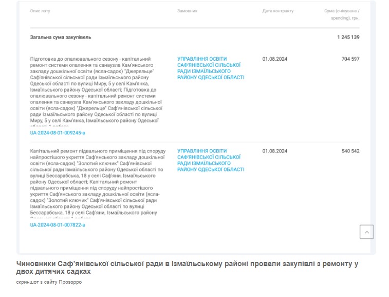 Сафʼянівська сільська рада в Ізмаїльському районі без використання електронної системи провела закупівлі з ремонту у двох дитячих садках. Обидва контракти дісталися «новонародженій» підприємиці Аміні Замфіровій, яка є студенткою третього курсу педуніверситету. Про це повідомляє «Антикорупційний вимір» з посиланням на Prozorro.
