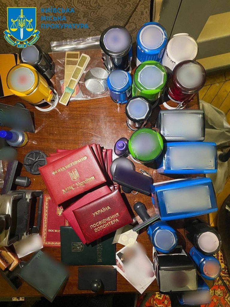 У колишнього волонтера під час обшуку вилучено, документи, які підтверджують незаконну видачу понад 300 підроблених посвідчень працівників-волонтерів Печерської районної організації Червоного Хреста, підроблені посвідчення волонтерів, а також амфетамін,