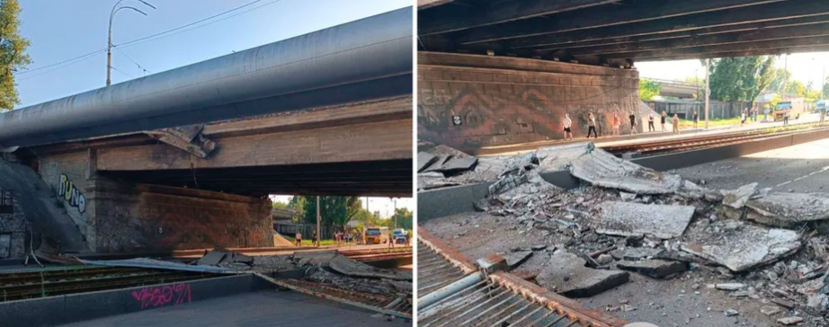 Через обвал фрагментів мосту на трамвайну лінію, затримується рух трамваїв №1 та № 3. Також тимчасово перекрито рух авто вздовж трамвайної лінії. Про це повідомили в КМДА.