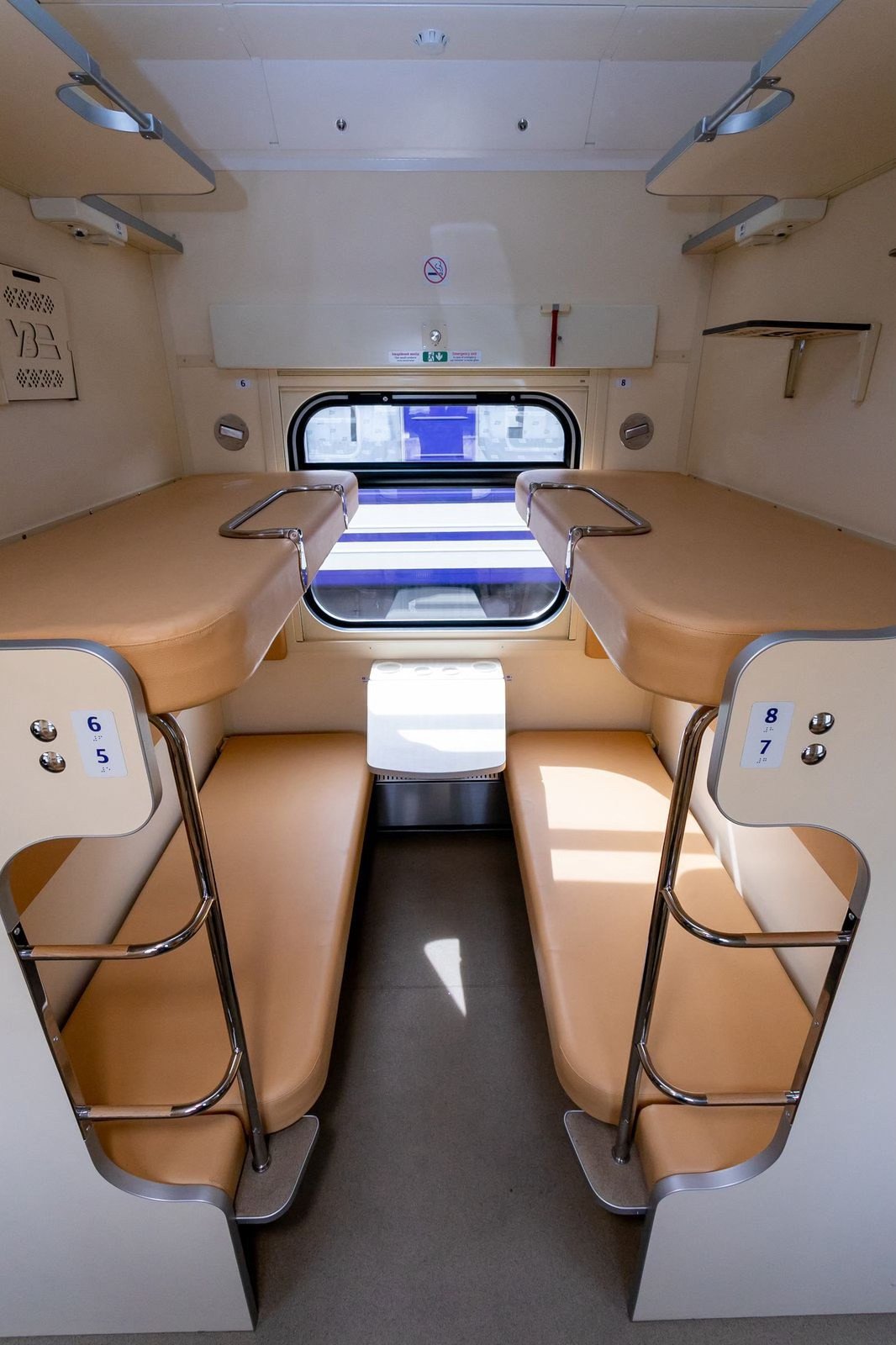 Кожен вагон розрахований на 58 пасажирів і обладнаний зручними полицями, сучасним освітленням, а також повноцінними місцями для сидіння на другій полиці. Особливістю нових вагонів є також манеж для немовлят та сповивальний столик — це створює додаткові умови для комфортної подорожі сімей з маленькими дітьми.