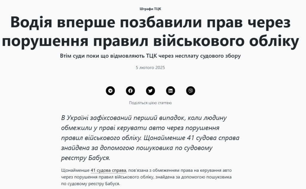 В Україні зафіксовано перший випадок, коли суд обмежив військовозобов’язаного у праві керування автомобілем через порушення правил військового обліку.