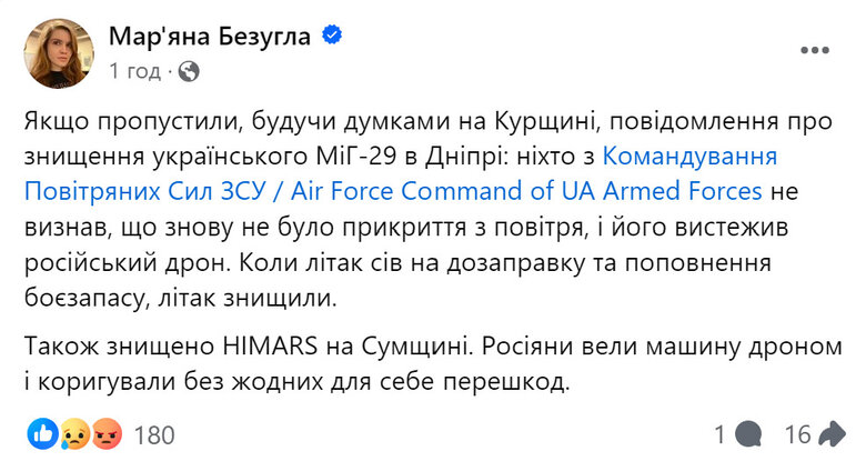 “Якщо пропустили, будучи думками на Курщині, повідомлення про знищення українського МіГ-29 в Дніпрі: ніхто з Командування Повітряних Сил ЗСУ не визнав, що знову не було прикриття з повітря, і його вистежив російський дрон. Коли літак сів на дозаправку та поповнення боєзапасу, літак знищили.