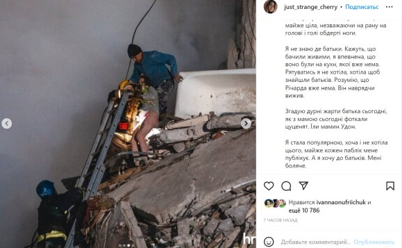 “Я не знаю де батьки. Кажуть, що бачили живими, я впевнена, що вони були на кухні, якої вже нема. Рятуватись я не хотіла, хотіла щоб знайшли батьків. Розумію, що Річарда вже нема. Він навряд чи вижив. Згадую дурні жарти батька сьогодні, як з мамою сьогодні фоткали цуценят. Їли мамин Удон. Я стала популярною, хоча і не хотіла цього, майже кожен паблік мене публікує. А я хочу до батьків. Мені боляче. Чи я існую взагалі?”, — додала врятована.