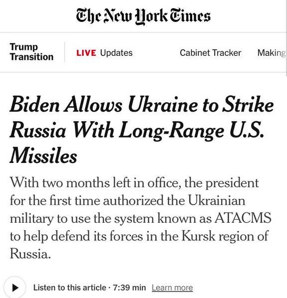 • Бaйдeн нapeштi дoзвoлив Укpaїнi нaнeсти удap пo Рoсiї aмepикaнськими дaлeкoбiйними paкeтaми ATACMS, — NYТ