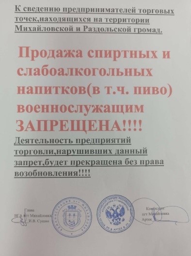 Деталі: Щоб зменшити моральне розкладання підрозділів, в ситуацію втрутилась комендатура Росгвардії та влада колаборантів Михайлівської громади, заборонивши крамницям продаж будь-якого алкоголю військовим РФ на територіях Михайлівської та Роздольської громад.