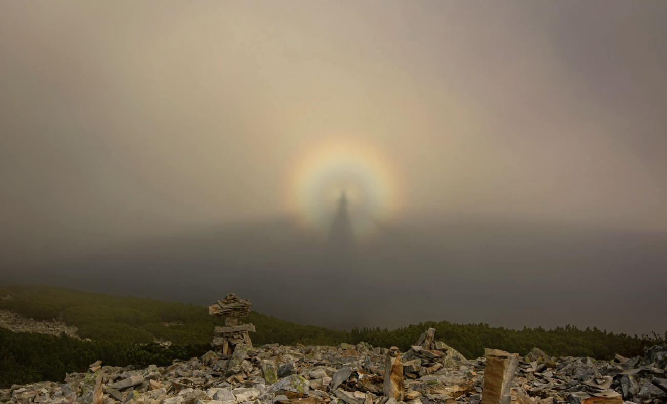 Це створює ефект велетенської тіні з райдужним ореолом – явище називають “Брокенський привид”.