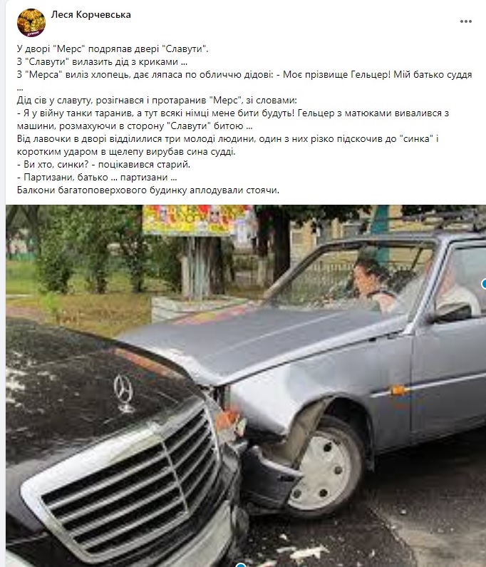 — Я у війну танки таранив, а тут всякі німці мене бити будуть! Гельцер з матюками вивалився з машини, розмахуючи в сторону «Славути» битою …