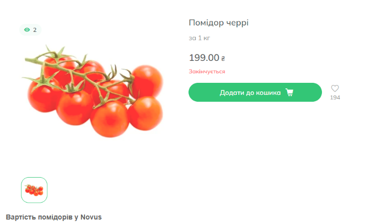 Водночас мережа Novus пропонує дешевші томати черрі – 199 грн/кг.