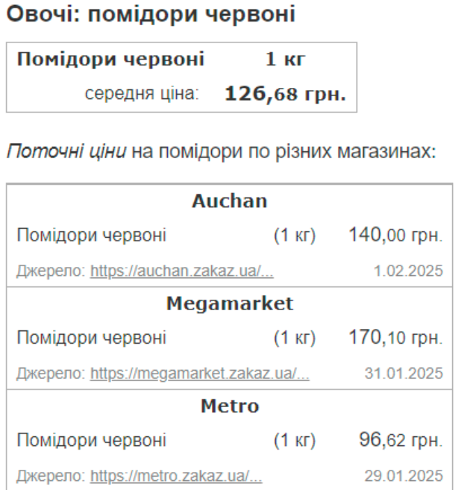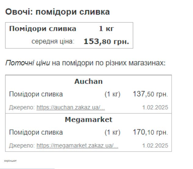 Інші види томатів мають значно доступніші ціни. Найнижча вартість помідорів сорту «сливка» зафіксована в Auchan – 137,50 грн/кг, тоді як у Megamarket їх продають за 170,10 грн/кг. Про це свідчать дані порталу «Мінфін».