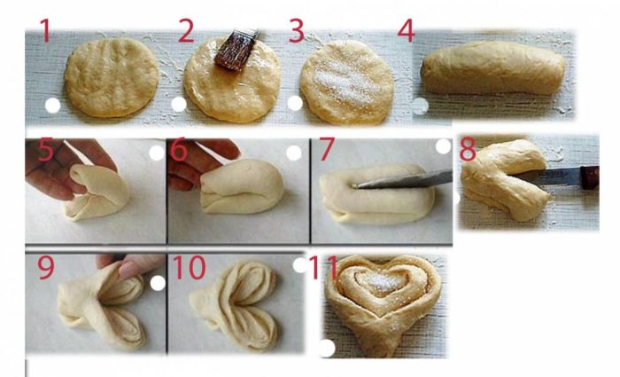 - Для цього поверніть тісто рулетом, защипніть краї, складіть уздовж навпіл, розріжте не до кінця, і розкрийте нашу плюшку.