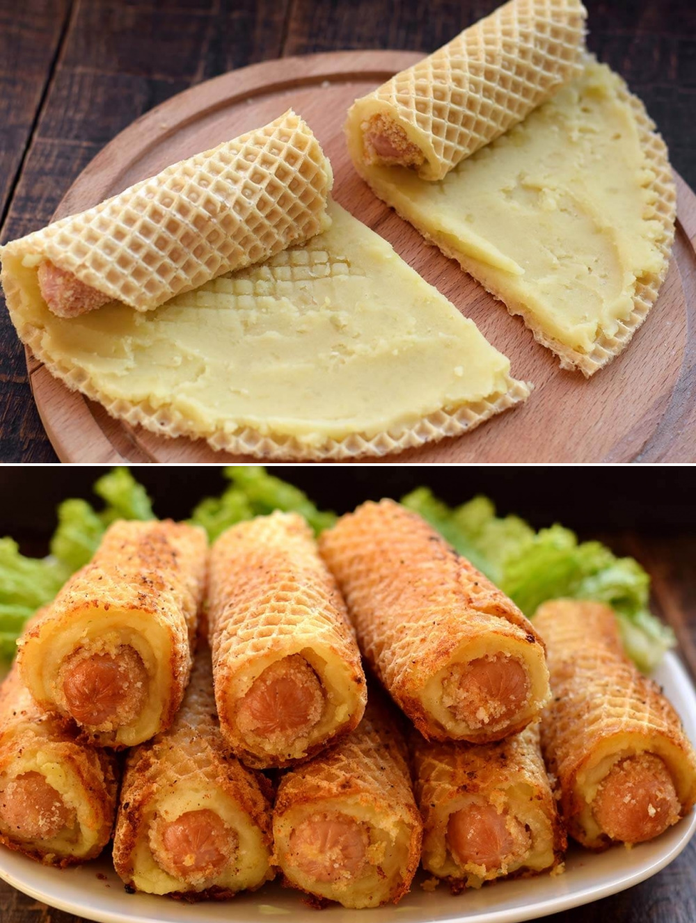Готуємо сосиски в картопляному тісті. Щоб картопля не розпадалася при смаженні, картопляне пюре наносимо на тонкі вафельні коржі, в які скручуються сосиски. Сосиски використовуйте хорошої якості, середньої товщини і довжини. Рулетики смажаться в олії на сковороді. Якщо у вас є вже готове картопляне пюре, то страву можна приготувати всього за 30 хвилин. Сосиски в картопляному тісті відмінно підійдуть для сніданку або ситного перекусу, їх зручно брати з собою в дорогу.