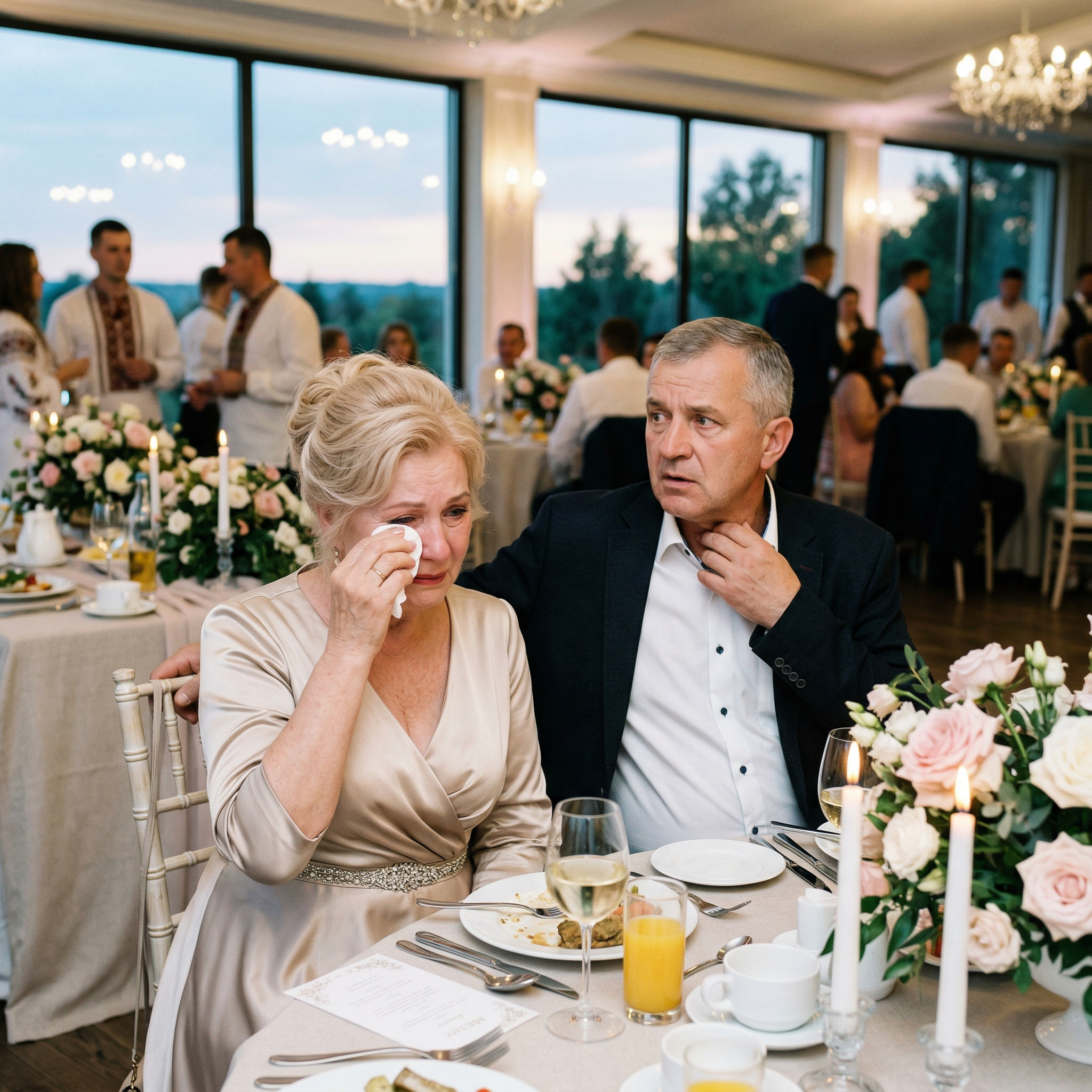 Батько пустив скупу чоловічу сльозу, тут же стер її рукавом і обійняв дочку.