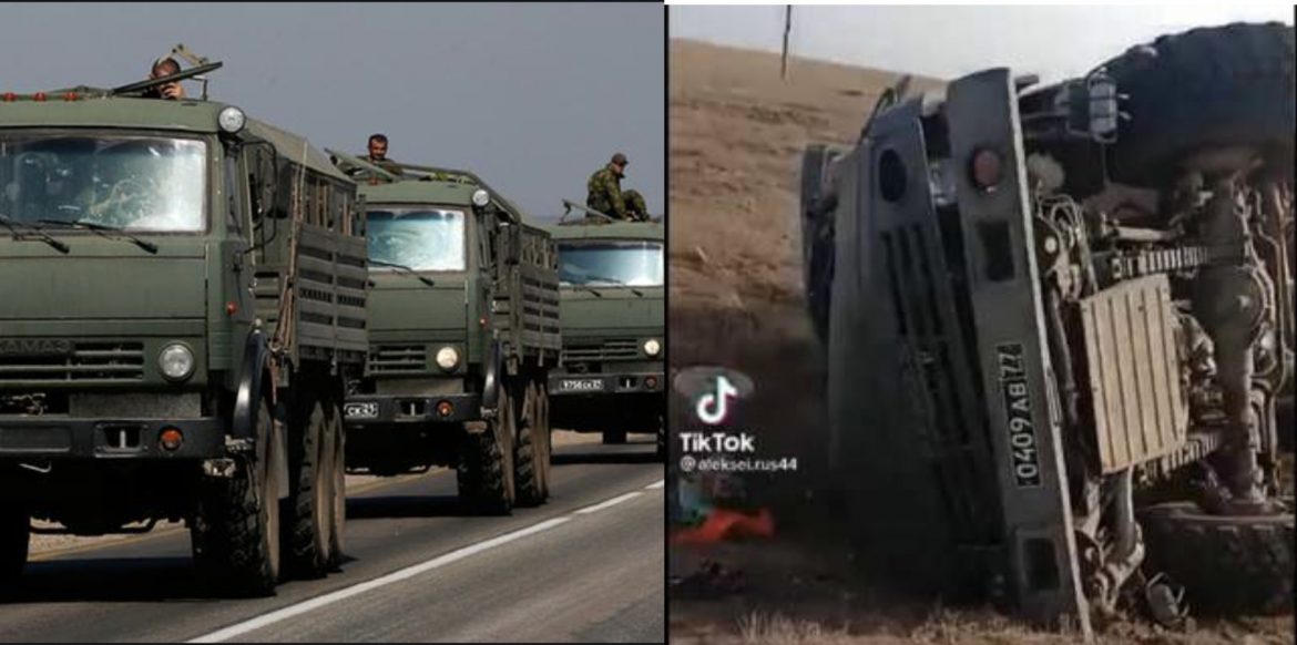 “Камаз” російських військових перекинувся і вилетів на узбіччя дороги на одній з автомагістралей Росії в Ростовській області. Очевидець зняв перевернулася машину на камеру свого мобільного телефону і опублікував в соціальних мережах.