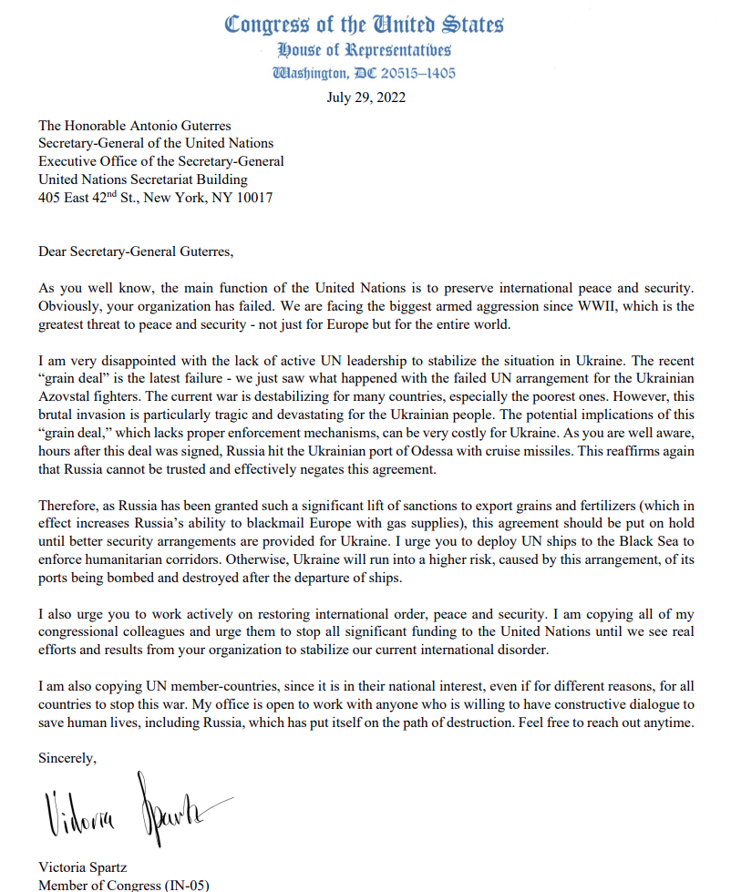Конгресвумен закликає Організацію Об’єднаних Націй призупинити угоду про експорт зерна з України, допоки не будуть забезпечені кращі заходи безпеки. Спартц вважає, що кораблі ООН мають перебувати в Чорному морі для забезпечення гуманітарних коридорів.