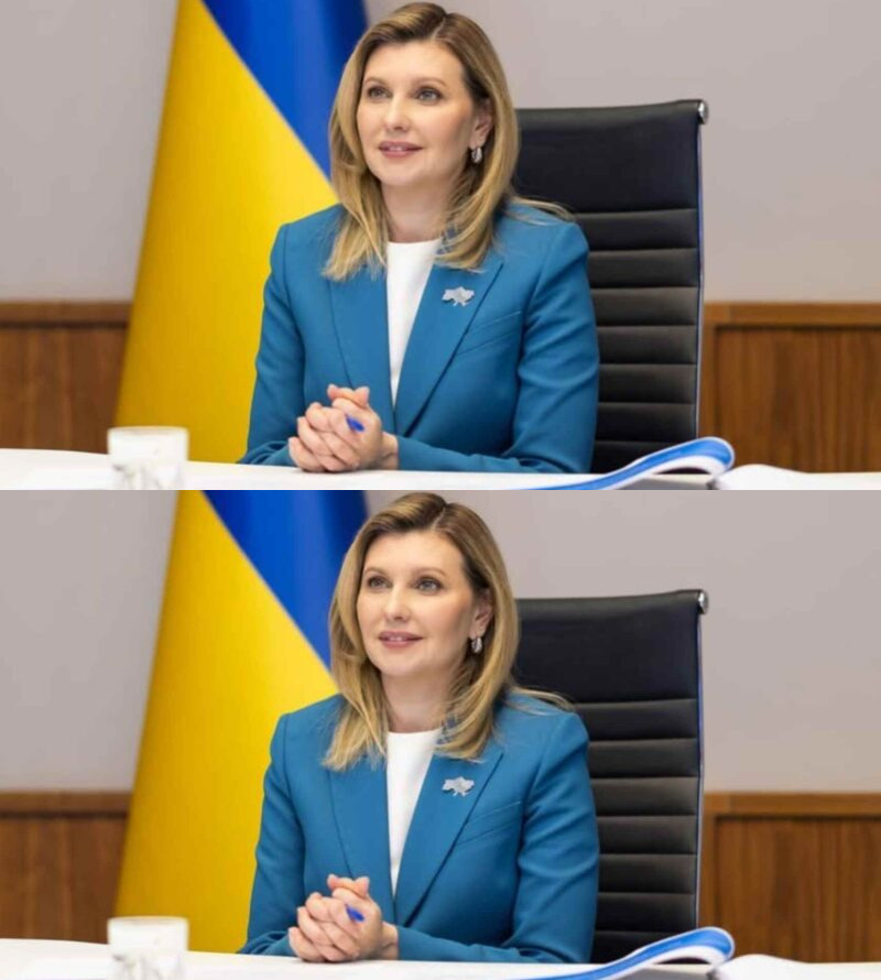 Під час онлайн-зустрічі Олена постала у блакитному жакеті і білій блузці. До лацкану жакета перша леді прикріпила свою улюблену символічну брошку у вигляді мапи України від українського бренду Gasanova.