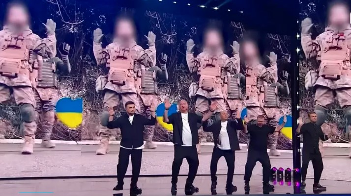 У новому номері шоу звучить пісня зі словами: “Ось такий простий формат — автомат наш дипломат. Бо не розуміють слів інших кляті москалі”. При цьому на сцені на фоні акторів показують відео з військовими, один з яких Юрій Назаренко. Військові танцюють під музику.