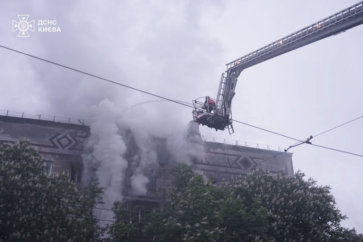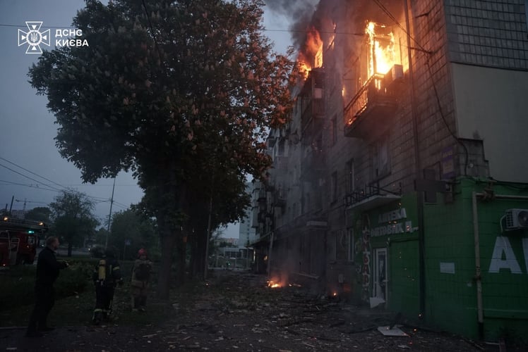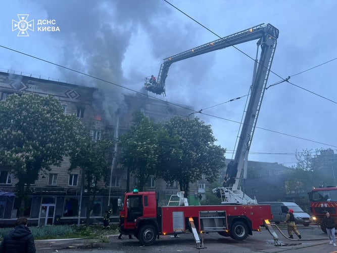 У Святошинському районі через російський обстріл виникли пожежі у кількох квартирах на верхніх поверхах житлового будинку, а у Дніпровському внаслідок атаки ворога сталося руйнування на верхньому поверсі житлового будинку.