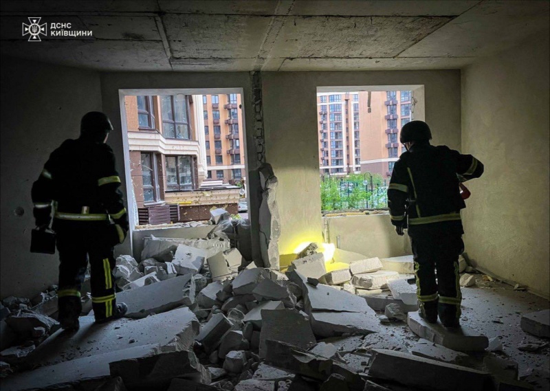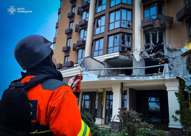 У ДСНС повідомили, що о 04:36 рятувальники отримали повідомлення про влучання у селі Софіївська Борщагівка під Києвом. Там внаслідок ворожої атаки дронів виникла пожежа, були зруйновані конструкції на 2-му поверсі десятиповерхового будинку в одному з житлових комплексів.