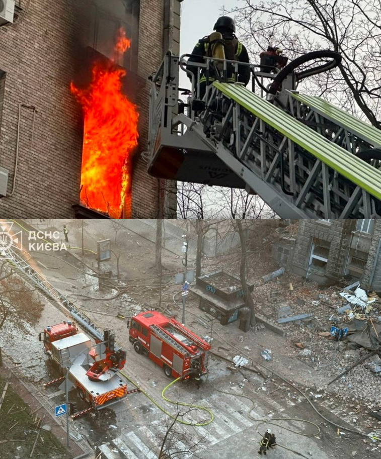 - Печерський район: Часткове руйнування 4-6 поверхів житлового будинку та загоряння на 4-5 поверхах. Надзвичайники врятували жінку похилого віку: у неї гостра реакція на стрес. Ще двох потерпілих чоловіків передали медикам. Пожежу локалізували. Тривають роботи з ліквідації та порятунку людей. Також триває ліквідація пожежі у нежитловій будівлі.
