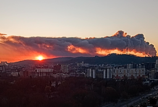 Над Львовом підіймається густий дим. Він виник внаслідок загоряння шин у цивільних складських приміщеннях, куди поцілили російські війська.