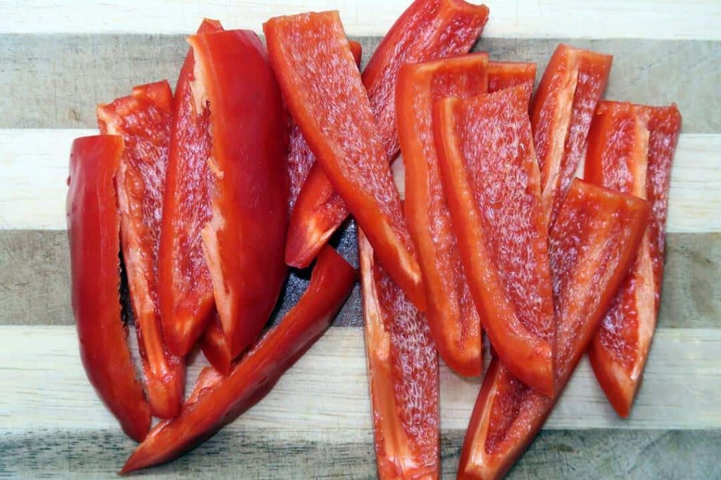 Болгарський перець промиваємо, розрізаємо вздовж і видаляємо насіннєву коробку. Нарізаємо на часточки.