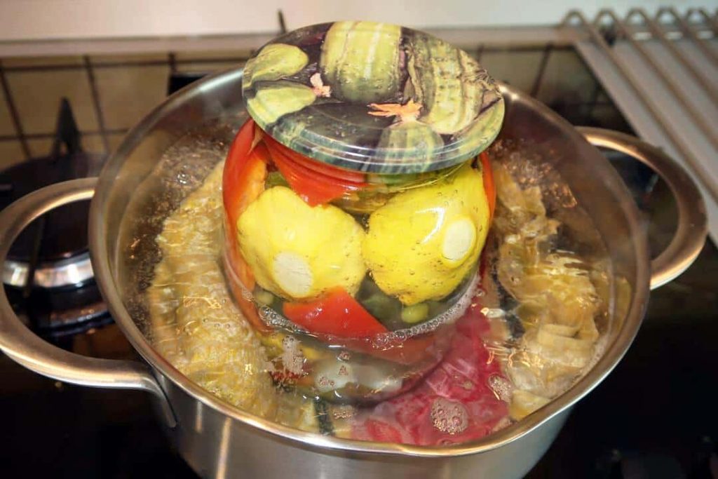Для стерилізації банки з овочами ставимо в каструлю, дно якої вистелено рушником. У каструлю наливаємо гарячу воду. Ставимо каструлю на вогонь і на великому вогні доводимо до кипіння. Потім вогонь зменшуємо, щоб не було бурхливого кипіння, і стерилізуємо протягом 10 хвилин.