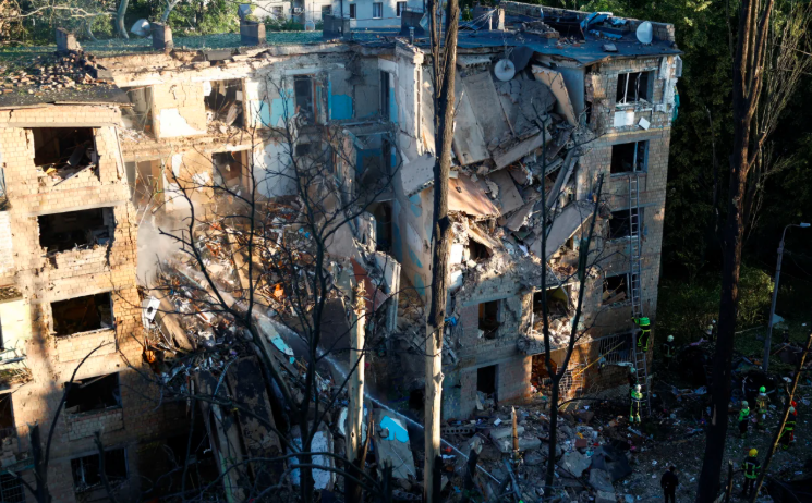 07:26 Агентство Reuters публікує фото наслідків нічних ударів РФ, зокрема на кадрах — зруйнований під’їзд багатоповерхівки в Шевченківському районі та нічні вибухи в Києві