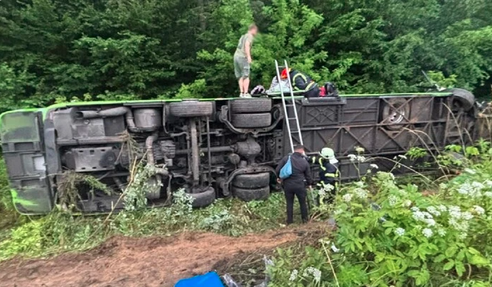 За попередніми даними поліції, 48-річний водій автобуса, житель Чернігова, під час обгону виїхав на зустрічну смугу та зіткнувся з Audi під керуванням 33-річного мешканця Львівського району. Після удару автобус з’їхав у кювет та перекинувся. У салоні автобуса перебували 65 пасажирів.