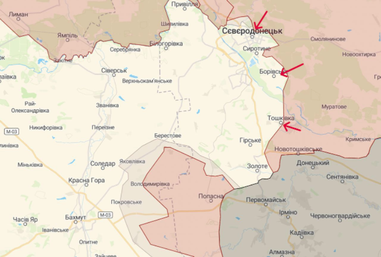 На Сєвєродонецькому напрямку ворог атакує у напрямках Щедрищеве – Сєвєродонецьк, Осколонівка – Борівське та Нижнє – Тошківка.
