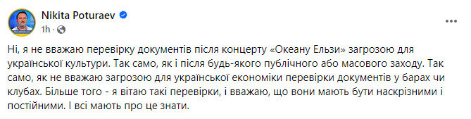 “Ні, я не вважаю перевірку документів після концерту “Океану Ельзи” загрозою для української культури. Так само, як і після будь-якого публічного або масового заходу. Так само, як не вважаю загрозою для української економіки перевірки документів у барах чи клубах. Більше того – я вітаю такі перевірки, і вважаю, що вони мають бути наскрізними і постійними. І всі мають про це знати”, – зазначив він.