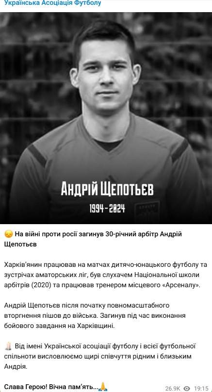 На війні проти російських окупантів загинув український футбольний арбітр Андрій Щепотьєв.