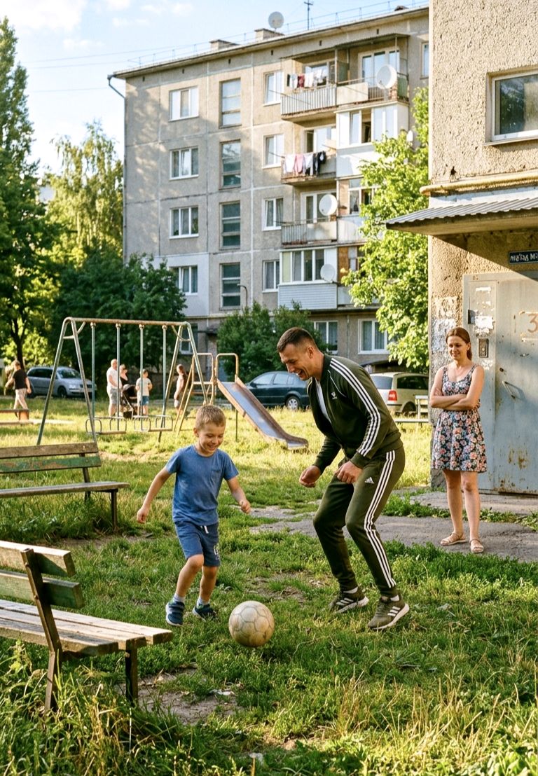Минув рік. Галя та Артем жили тихо, аж поки Ніна Петрівна не помітила сусідку з букетом квітів. А згодом побачила у дворі дивну картину: Артем ганяв м’яча з високим чоловіком у спортивному костюмі. Це був Володимир. Він не кричав «як треба», він просто грав.