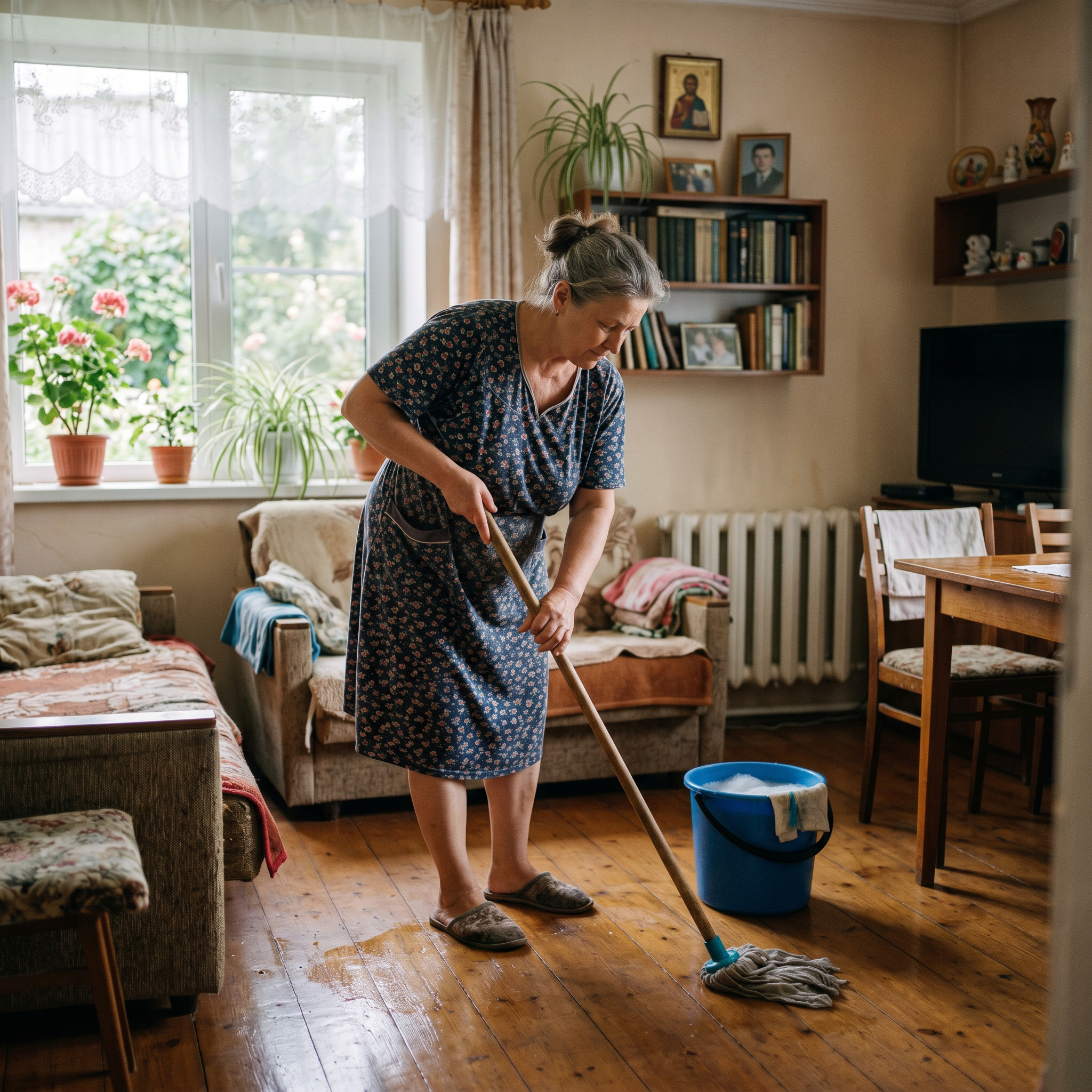 Оксана вирішила зробити генеральне прибирання в будинку, поки така погода і на городі робити нічого.