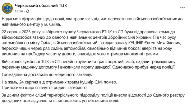 «Зі збірного пункту Черкаського РТЦК та СП була відправлена команда військовозобов’язаних до одного з навчальних центрів Збройних Сил України. Під час руху автомобіля по місту Сміла, військовозобов’язаний — солдат запасу Кушнір Євген Михайлович, перескочивши через ряд сидінь автомобіля, самовільно відчинив бокові двері та на ходу вискочив на проїжджу частину дороги, внаслідок чого отримав множинні травми», — йдеться в повідомленні.