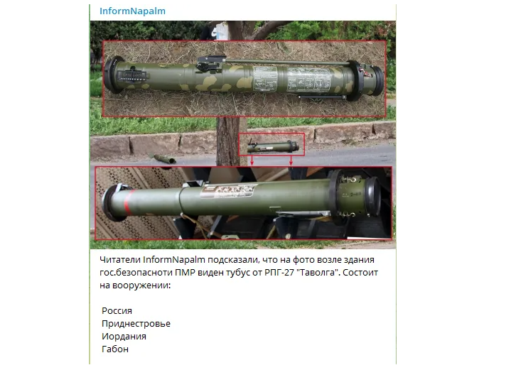 На дорозі лежать відстріляні тубуси від гранат. Користувачі впізнали в них “упаковку” від РПГ-27 “Таволга”, який є на озброєнні Росії, Придністров’я, Йорданії та держави Габон. Про це повідомив волонтерський Telegram-канал Inform Napalm.