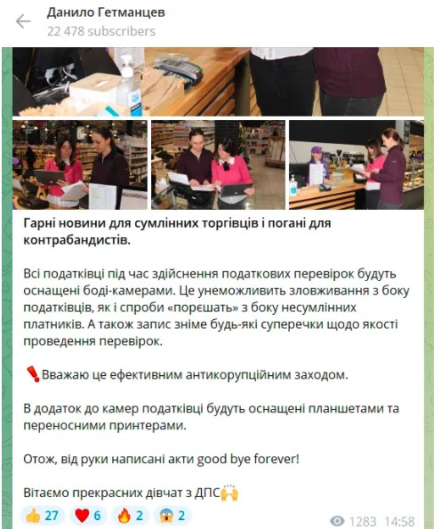 Про це на своїй сторінці в Telegram повідомив голова комітету з питань фінансів, податкової та митної політики Данило Гетманцев. “Всі податківці під час здійснення податкових перевірок будуть оснащені бодікамерами. Це унеможливить зловживання з боку податківців, як і спроби “порєшать” з боку несумлінних платників. А також запис зніме будь-які суперечки щодо якості проведення перевірок. Вважаю це ефективним антикорупційним заходом”, – зазначив він.
