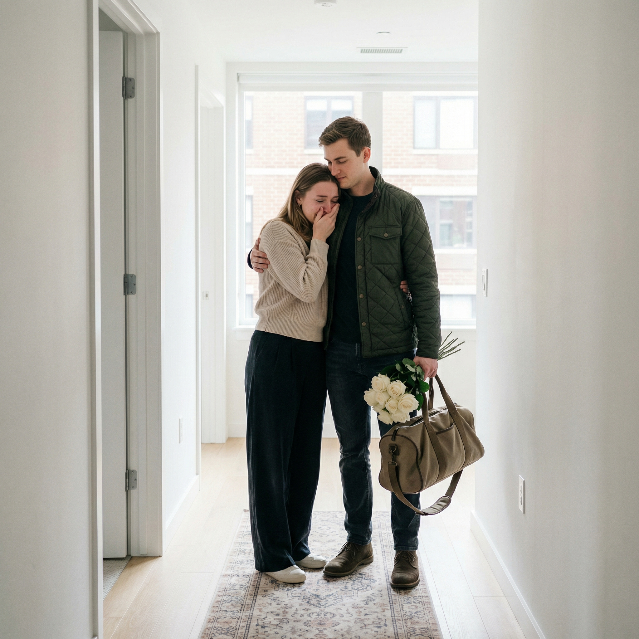 Дмитро нетерпляче відчинив двері і зайшов до квартири, однією рукою тримаючи свою величезну дорожню сумку, а іншою – букет білих троянд. Як тільки він переступив поріг, зі спальні радісно вибігла його дружина і, кинулася в обійми чоловіка.