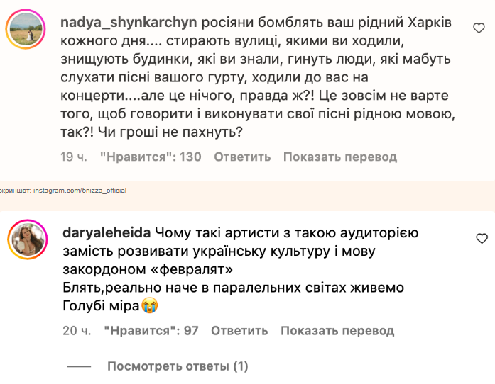 У коментарях українці були вражені таким запрошенням на концерт. Вони звернулися до артистів із проханням оголосити себе російськими виконавцями, а також не розуміли, чому саме такі співаки поширюють «українське» за кордоном. Люди звертали увагу, що поки Росія бомбить Харків, його уродженці продовжують бути частиною російської культури.