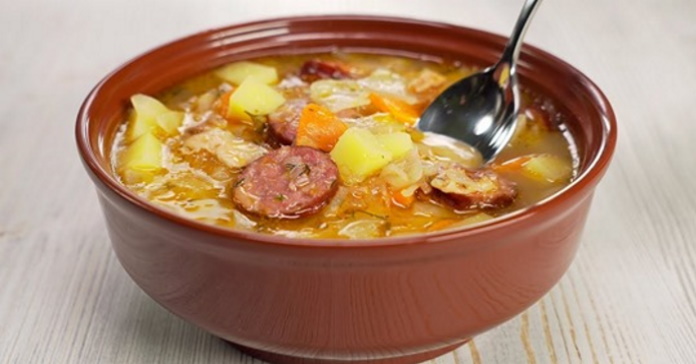 1. Наріжте цибулю дрібними кубиками, моркву тонкими півкільцями, капусту і картоплю наріжте невеликими кубиками, ковбасу круглими скибочками, бекон невеликими шматочками.