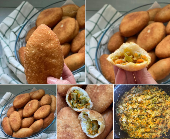 Відколи з‘явилася молода капуста, за мною «ходять» ці пиріжки. Нарешті, таки їх насмажила, наїлася, заспокоїлася і пишу вам рецепт. Тут головне це тісто – повітряне і м‘яке всередині і пухирчате, ледь слойоне ззовні (ото пишу, а очі аж закочуються догори від одного спогаду, така то смакота); начинку робите свою улюблену, у мене, як ви зрозуміли, тушкована молода капуста. Дам пропорції на начинку теж, бо вона точно до грама на цю кількість тіста.