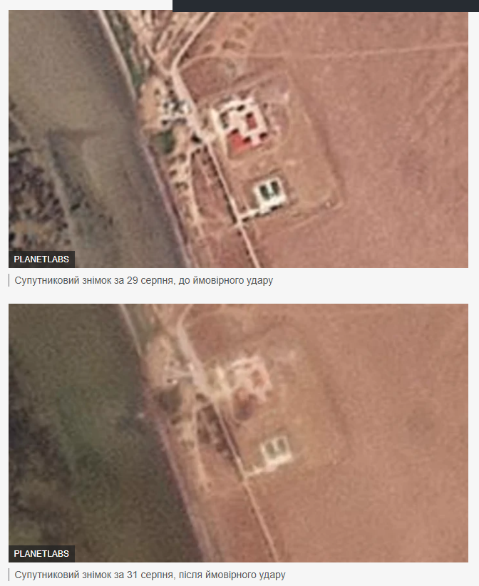Порівняння супутникових знімків ураженої ракетами «Фламінго» застави ФСБ в Криму. Ліворуч знімок за 28 серпня, праворуч за 31 серпня 2025 року. Колаж Мілітарний