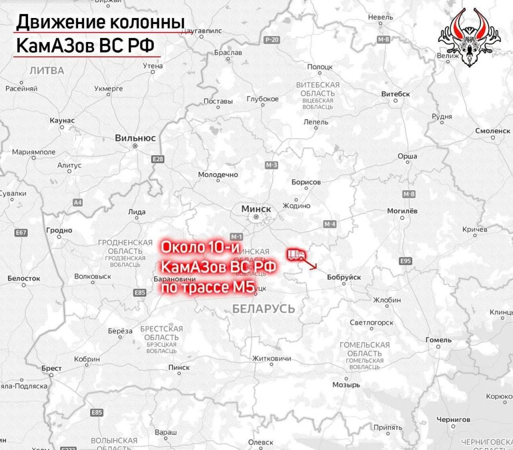 Колона КамАЗів РФ напрявляється трасою М5 в напрямку військового аеродрому Бобруйск.