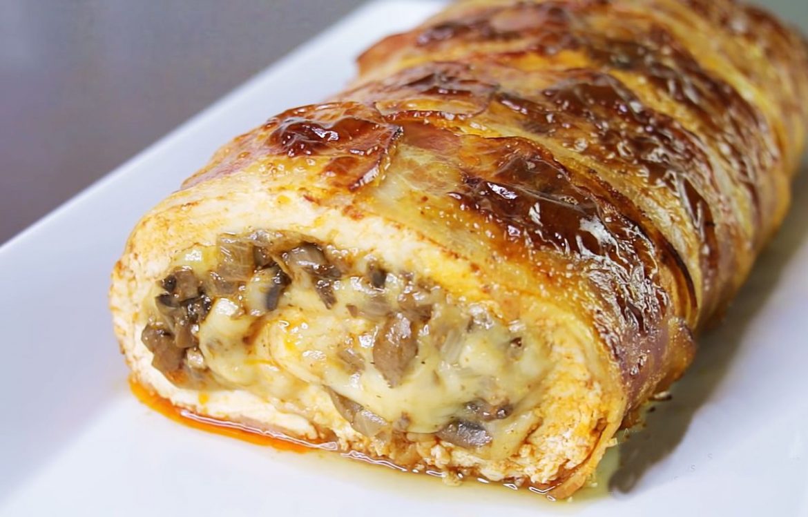 - Знову розстеляємо харчову плівку і викладаємо на неї пласт з бекону. Викладаємо бекон в два ряди по 8 шматочків в кожному. У центр беконового прямокутника кладемо рулет, потім обережно знімаємо з нього плівку і обертаємо, за допомогою плівки, рулет в бекон спочатку з одного боку, а потім з іншого.