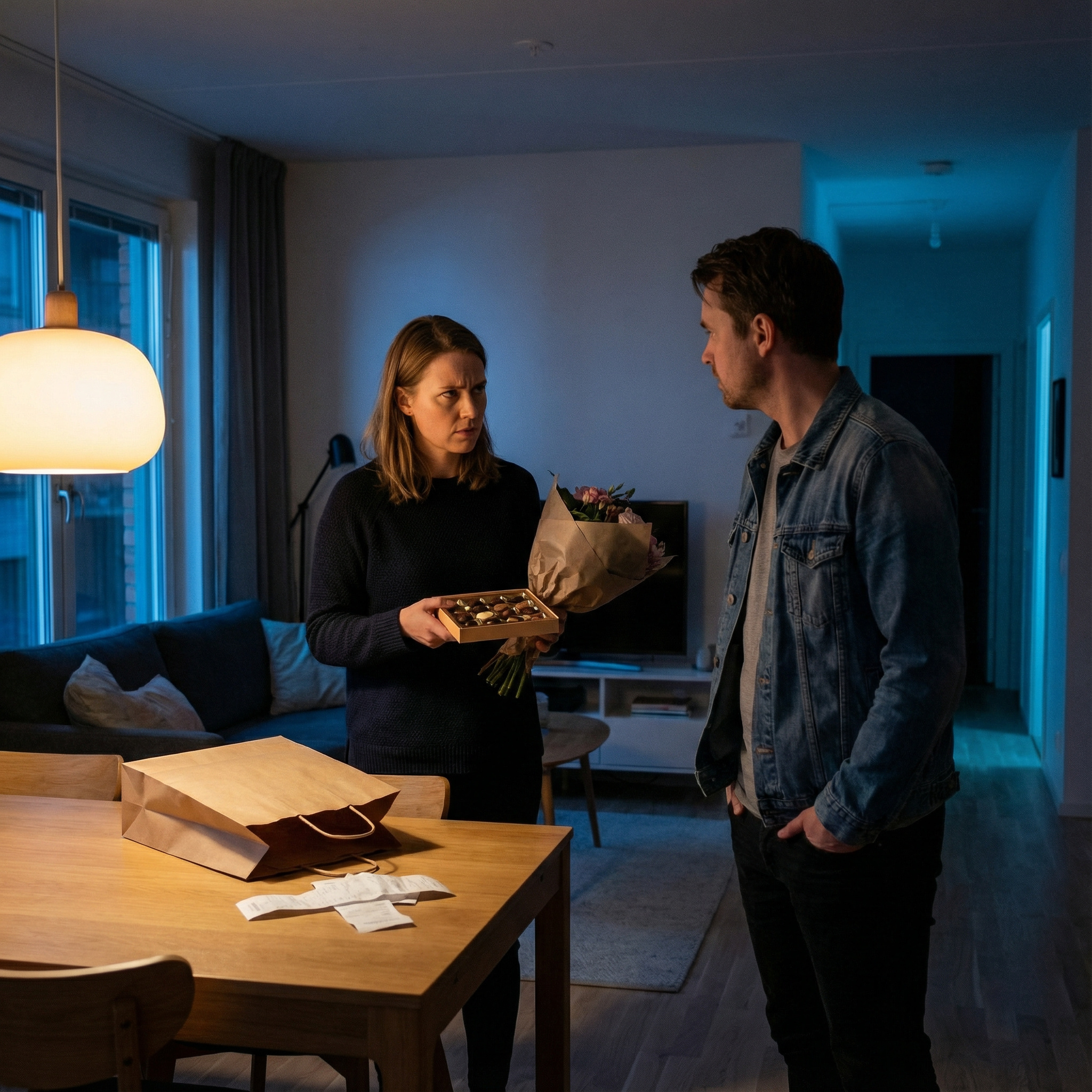 – Що це таке? – різко спитала Анастасія. – Кому ти цукерки купував? І квіти?