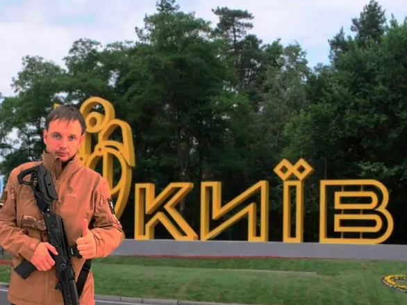 На світлині колаборант позує з автоматом у руках на тлі велетенського надпису з назвою української столиці.