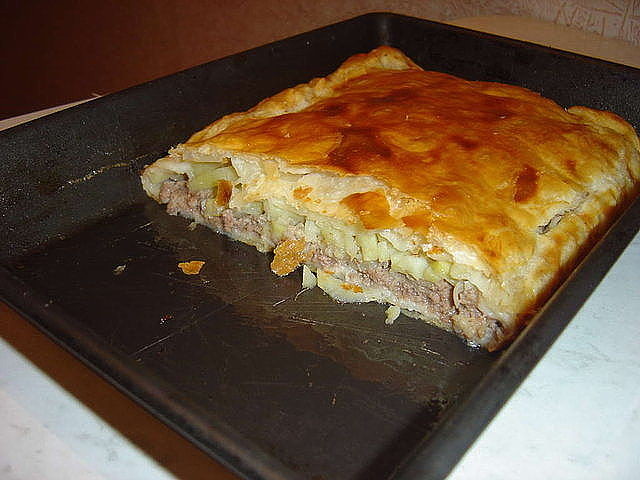 Пиріг цілком замінить улюблену піцу – начинка в ньому практично така ж – помідори, шинка, цибуля, сир, приправи і спеції. Приготування пирога займає зовсім небагато часу – тісто використовується готове, листкове бездріжджове.