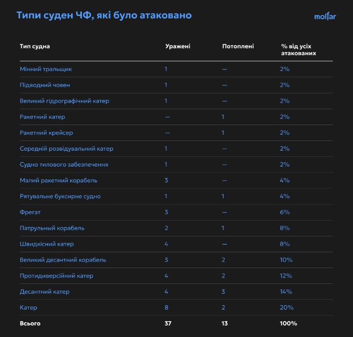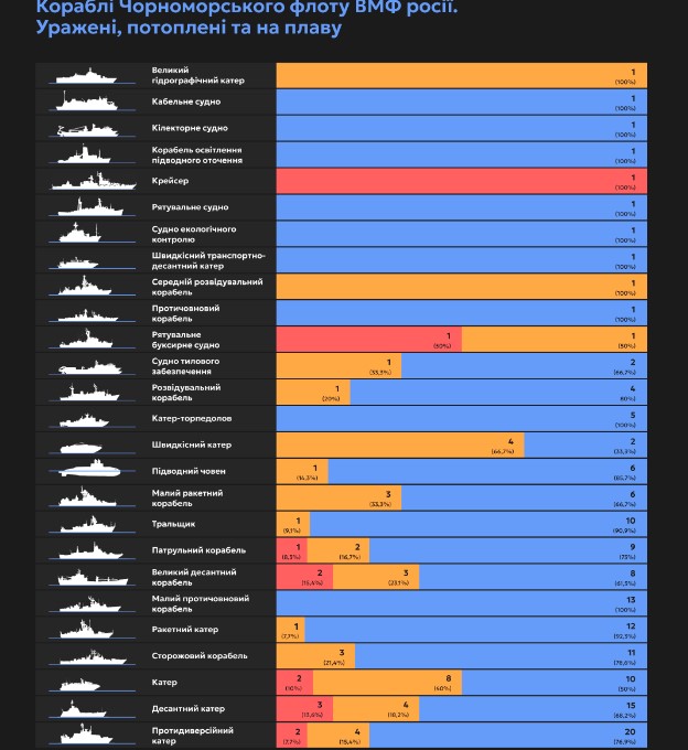 Проєкт Molfar, який займається воєнними розслідуваннями, ідентифікацією воєнних злочинців та геопросторовою розвідкою, підрахував, скільки російських плавзасобів флоту під час великої війни знищено та виведено з ладу і скільки ще залишаються в строю.